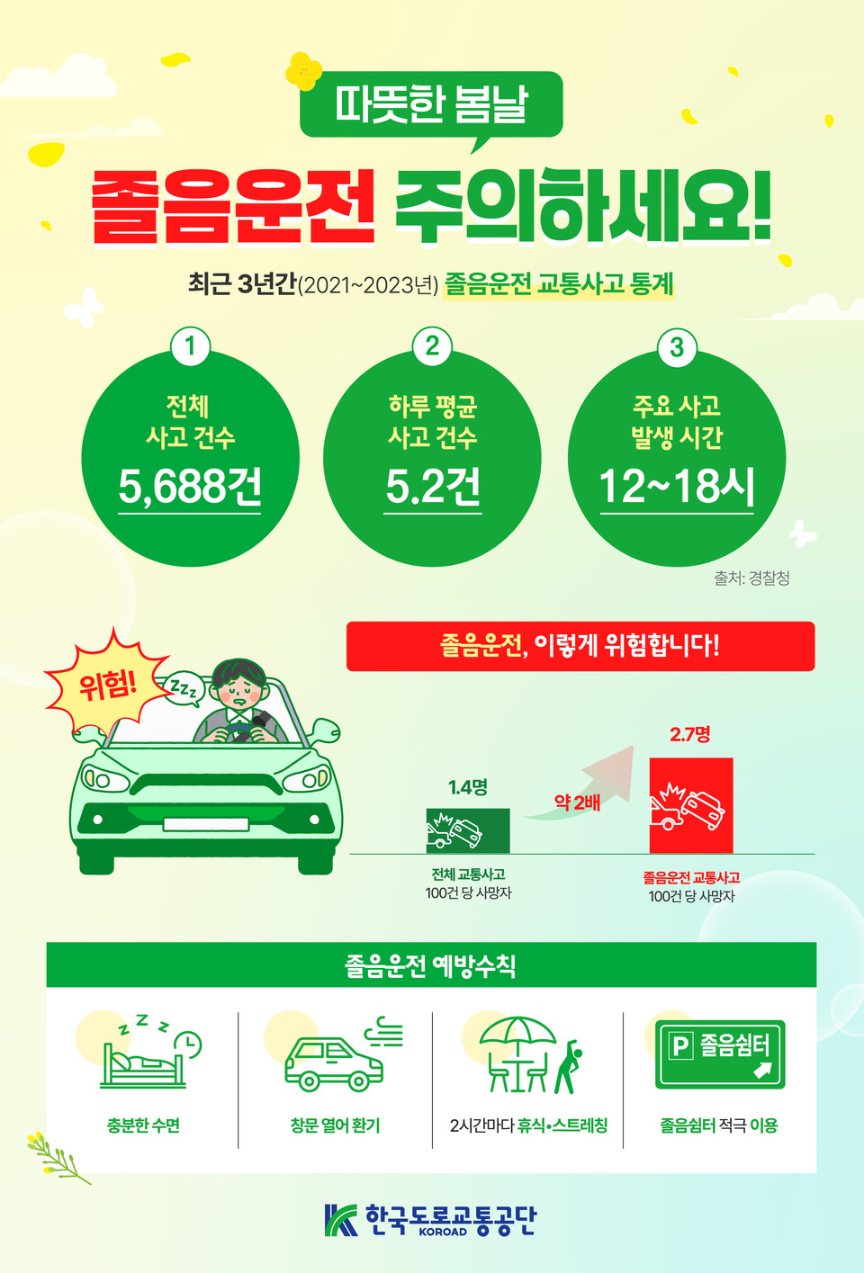 한국도로교통공단 관계자는 “졸음운전은 예고 없이 찾아오며 단 한 순간의 방심이 대형 사고로 이어질 수 있다”며 운전자 모두가 경각심을 갖고 올바른 운전 습관을 실천해 줄 것을 당부했다.