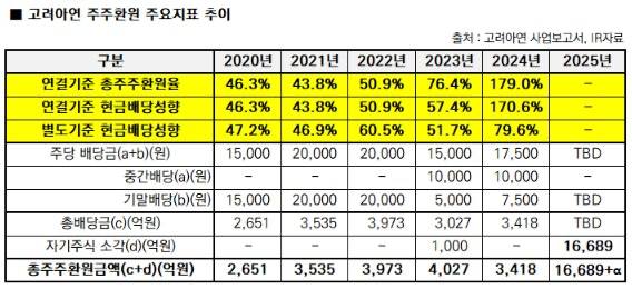 또 실제로 별도기준 배당성향을 52%로 초과 달성한 2023년과 마찬가지로 2024년 별도기준 배당성향도 80%였다. 이는 목표치를 크게 웃돌았다는 평가를 받는다.