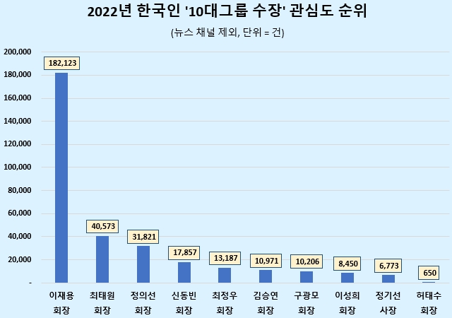 이어 구광모 LG그룹 회장이 1만971건으로 7위, 이성희 농협 회장이 8450건으로 8위였다. 10대 그룹 수장 중 유일하게 사장 직급인 정기선 HD현대 사장이 6773건으로 9위, GS그룹 동일인인 허창수 회장의 막내 동생인 허태수 회장이 650건으로 10위를 기록했다.