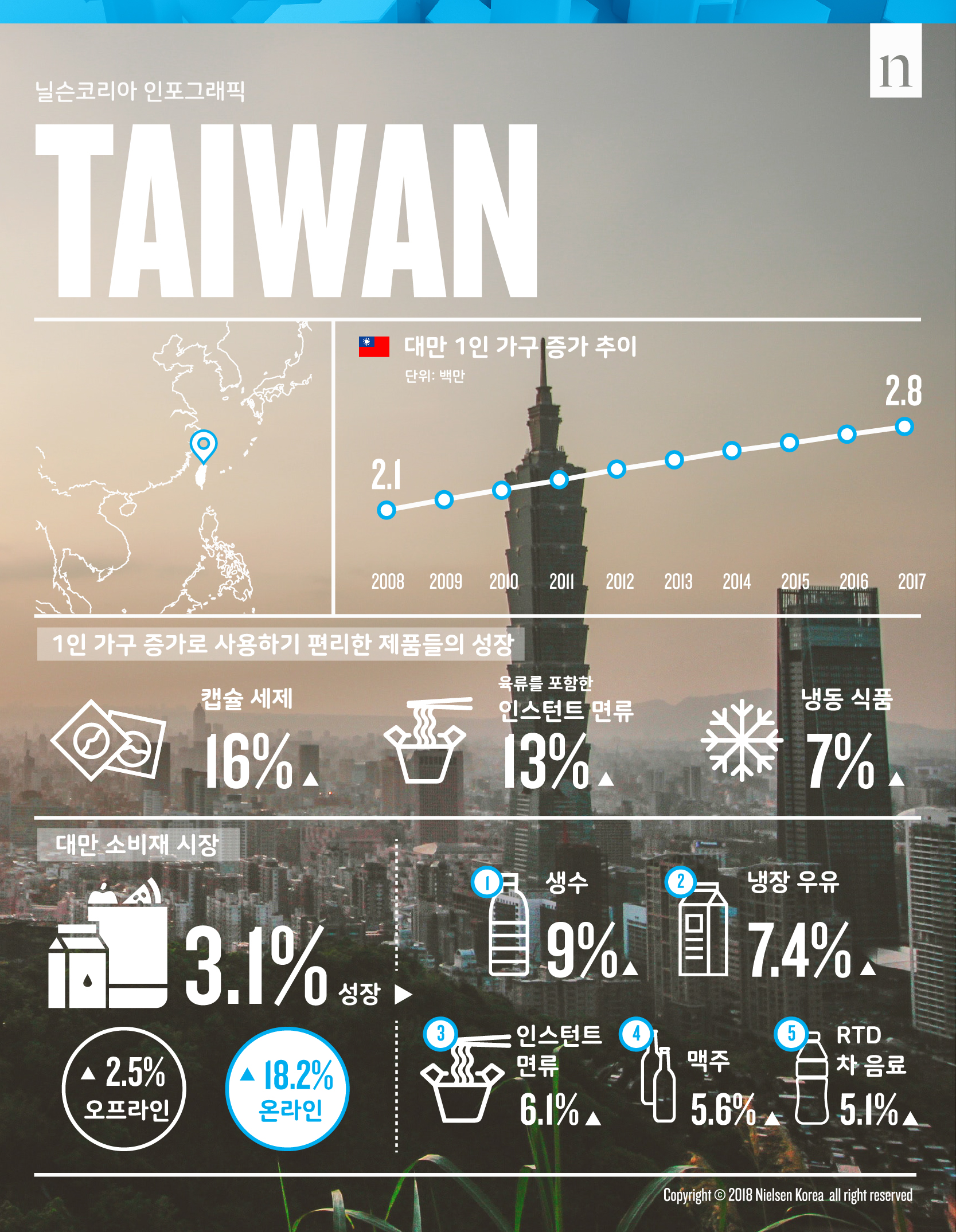 대만 소비재 시장은 2017년 기준 약 3%의 성장을 기록하고 있으며, 오프라인 채널에서 2.5%, 온라인 채널에서는 무려 18.2% 성장을 이뤄내고 있습니다. 식품 카테고리 중 가장 성장률이 높은 제품은 생수(9%), 냉장 우유(7.4%), 인스턴트 면류(6.1%), 맥주(5.6%), RTD 차 음료(5.1%) 등입니다.