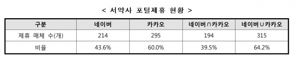 이와 함께 491개 서약사 가운데 315개(64.2%) 매체가 네이버·카카오 등 양대 포털사이트를 통해 뉴스를 제공하고 있었습니다. 포털별로는 네이버 제휴 매체가 214개, 카카오 제휴 매체가 295개였으며 네이버와 카카오 모두와 제휴를 맺은 매체는 194개로 나타났습니다. 여기에 서울 소재 매체가 395개(80.5%)로 대부분을 차지했으며 경기권(35개, 7.1%), 충청권(27개, 5.5%), 경상권(22개, 4.5%), 전라권(6개, 1.2%), 제주(4개, 0.8%), 강원(2개, 0.4%) 순으로 매체가 분포돼 있었습니다.