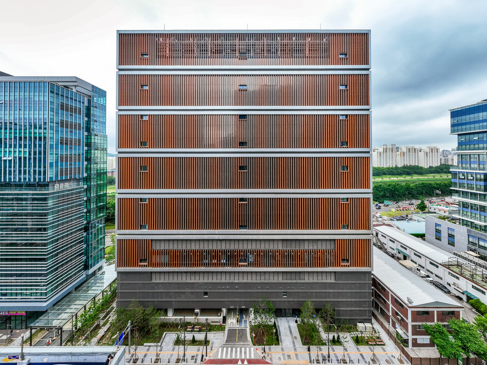 외관 전면부는 금속 루버(Louver)를 활용해 서버랙(Server Rack)의 형상을 표현, 미래지향적인 이미지를 구현했고 외관 후면부에는 일조량을 정밀 분석해 163.38kW 규모의 태양광 패널을 설치, 상용 가능한 친환경 발전 설비를 구축함으로써 지속가능성을 고려한 설계를 실현했다.