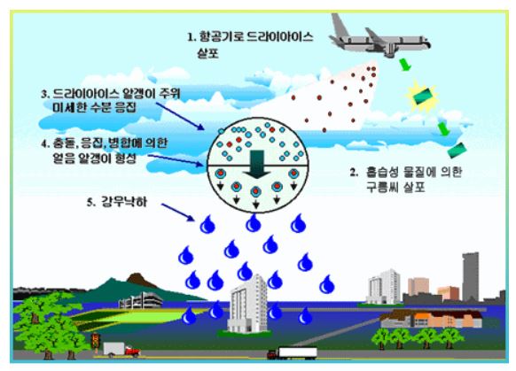 인공강우는 구름 속에 인위적으로 강수입자를 성장시킬 수 있는 구름 씨앗(인공강우 물질)을 살포, 빗방울의 성장을 도와 비가 내리게 하는 기술을 말합니다.