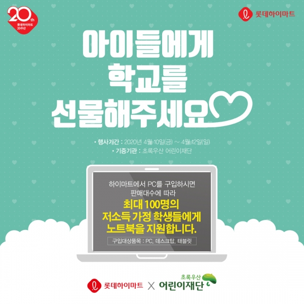롯데하이마트가 온라인 개학을 맞은 저소득 가정 학생을 위한 노트북 기부 캠페인 '아이들에게 학교를 선물해주세요'를 전개한다.