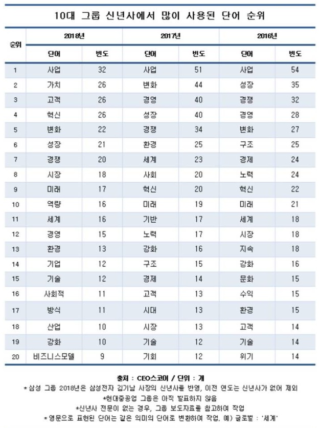 이번 조사에서 지난 2일 기준 신년사를 발표하지 않은 현대중공업은 제외했고, 이건희 회장의 와병으로 2015년부터 신년사를 발표하지 않은 삼성그룹은 김기남 삼성전자(DS부문) 사장의 신년사로 대체했다.