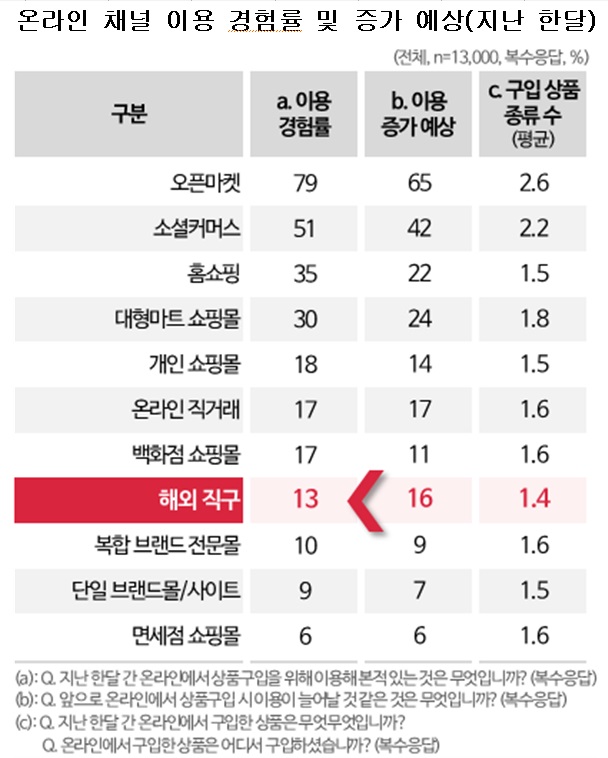 이 자료에 따르면 지난 한 달 국내 소비자들은 오픈마켓(79%), 소셜커머스(51%), 홈쇼핑(35%), 대형마트 쇼핑몰(30%)에서 상품을 구매했다. 해외직구는 13%로 개인쇼핑몰(18%), 온라인직거래(17%), 백화점 쇼핑몰(17%)에 이어 전체 조사 11개 채널 중 8번째에 이름을 올렸다.