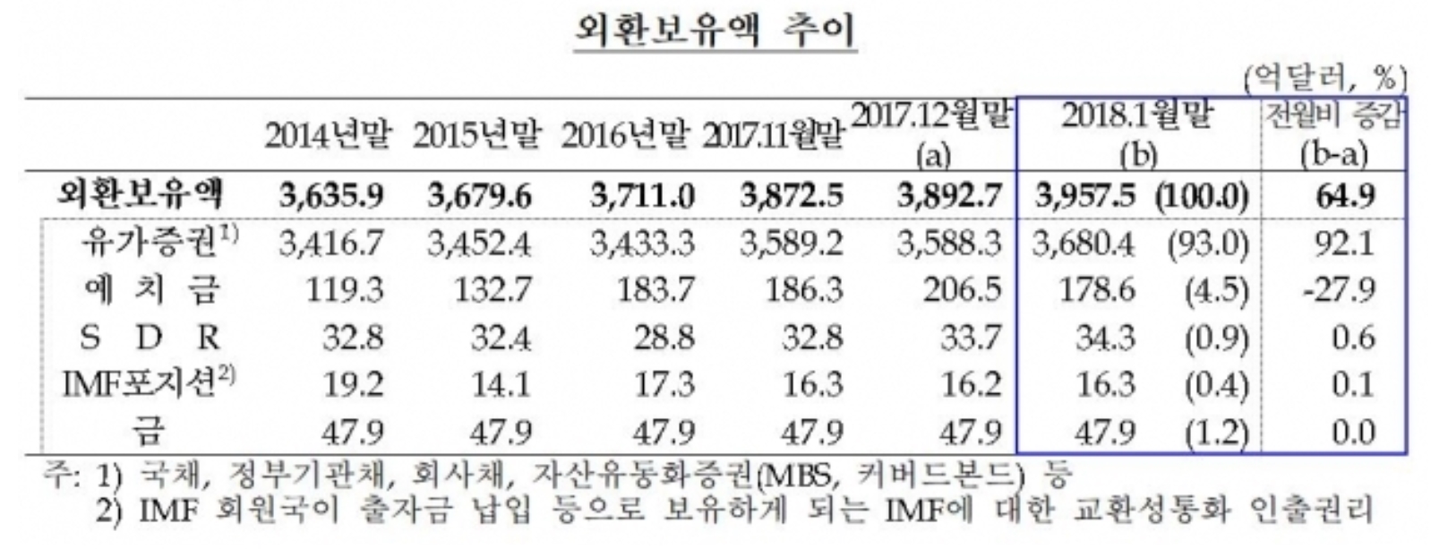 작년 12월 말 기준 우리나라의 외환보유액 규모는 세계 9위 수준으로 유가증권 3680억4000만 달러(93%), 예치금 178억6000만 달러(4.5%), SDR(Special drawing rights) 34억3000만 달러(0.9%), 금 47억9000만 달러(1.2%), IMF포지션 16억3000만 달러(0.4%)로 구성돼 있다.