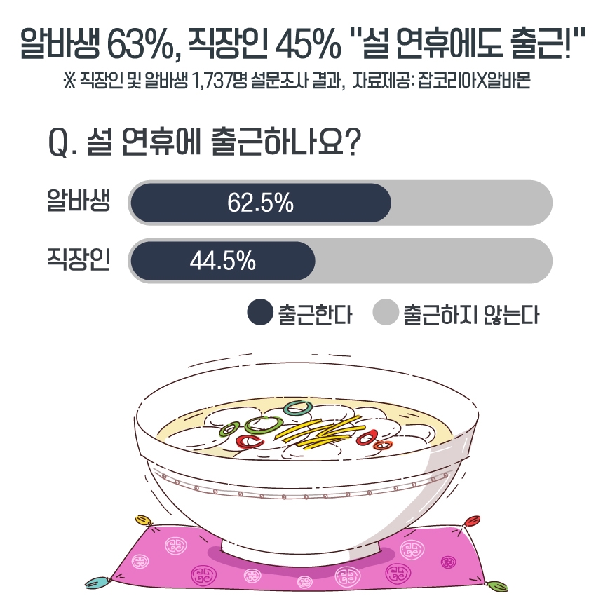 모두에게 즐거운 설 명절이 코앞으로 다가왔다. 하지만 아르바이트생 5명 중 3명과 직장인 5명 중 2명 가량이 이번 설 연휴기간에도 출근해 일을 해야 하는 것으로 나타났다. 대표적인 이유는 연휴에도 회사 및 매장은 정상 영업을 하기 때문이었다.