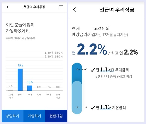 첫 급여 우리 적금의 경우 매달 100만원 이하로 자유 적립이 가능한 상품으로 급여 이체 우대 조건 충족 시 최고 연 2.2% 금리를 제공한다.