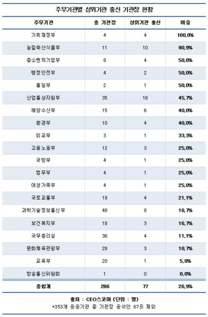 18일 기업 경영성과 평가사이트 ‘CEO스코어(대표 박주근)’에 따르면 공공기관 경영정보공개시스템 알리오에 공시된 공기업 및 준 정부기관 등 353곳 중 기관장이 공석인 67곳을 제외한 286곳의 기관장 출신을 조사한 결과 286명 중 77명(26.9%)이 상급 주무부처 출신이었다고 밝혔다.