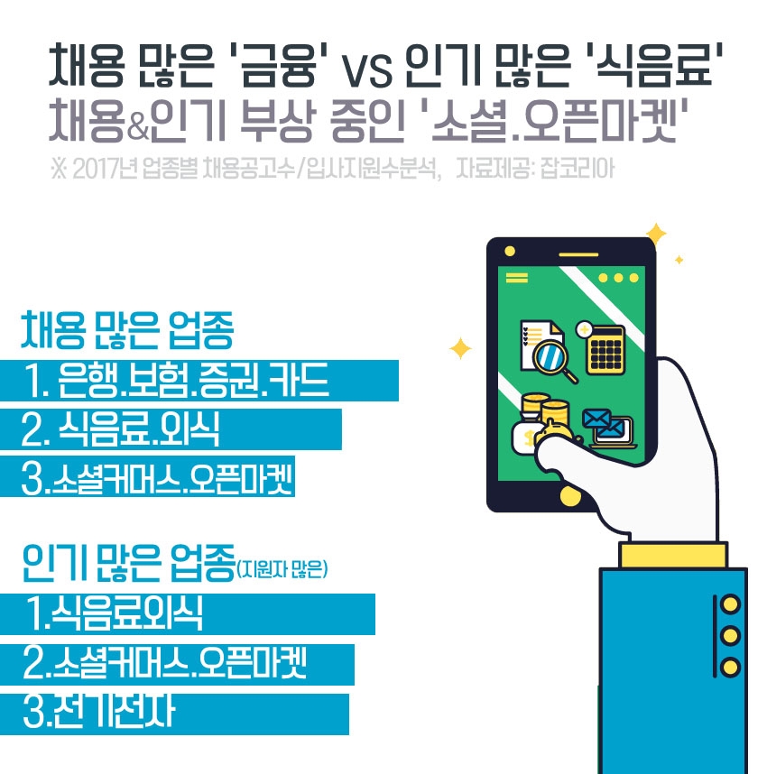 취업포털 잡코리아가 2017년 자사사이트에 등록된 업종별 채용공고수와 입사지원자수를 분석한 결과, 채용공고가 가장 많이 등록된 업종은 ‘은행·보험·증권·카드(금융)’ 업종으로 연간 전체 채용공고수 중 9.0%로 높았다. 연간 등록된 채용공고 10건중 약 1건은 금융업계 채용공고였던 셈이다.