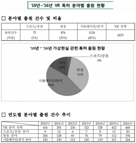특허청 자료를 분석한 결과 2010년 이후부터 2016년까지 출원 공개된 VR 관련 특허 출원건수는 2475건에 달합니다. 이 중 스포츠 분야가 75건, 방송 분야가 876건, 3차원 모델링 및 시뮬레이션 관련 분야가 1124건 출원됐습니다.