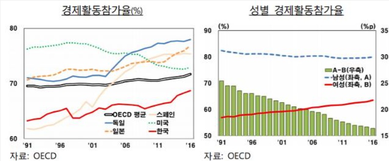 세계적으로 여성 경제활동참가가 증가하는 것과 반대양상을 보였습니다. 주요국들은 저출산과 인구 고령화로 인해 생산가능한 인구가 줄어드는 것을 여성의 경제활동 참여 확대로 상쇄하고 있습니다.