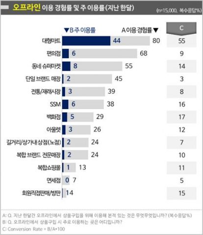 주 이용률도 대형마트가 44%로 1위였으며, 나머지 채널은 모두 10% 미만에 불과했습니다.
