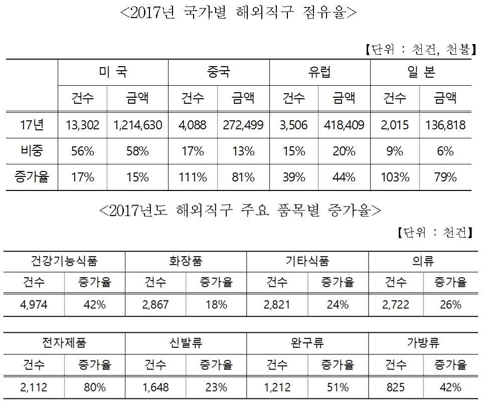 구체적으로 지난해 해외직구는 2359만건, 21억1000만 달러였습니다. 이는 2016년보다 건수는 35.6%, 금액은 29.1% 증가한 수치라고 합니다. 이 같은 증가세는 최근 5년간 해외직구 평균 증가율 27%를 크게 상회한 기록이기도 합니다.