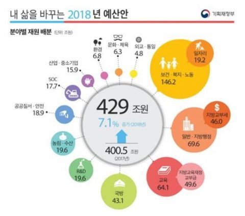 문재인 정부가 일자리 창출과 복지 등의 구현을 위해 적극적인 재정정책을 꺼내 들었다. 내년 예산을 올해보다 7.1% 늘어난 429조원으로 정했다. 2009년(10.6%) 이후 9년 만에 증가 폭이 가장 큰 ‘슈퍼예산’으로 일자리를 포함한 복지예산이 12.9% 늘어나면서 비중이 처음으로 34%를 넘어섰다. 사회간접자본(SOC)은 20%나 삭감했다.