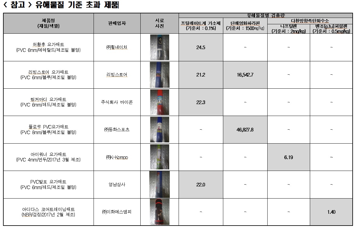 한국소비자원이 시중에 유통·판매 중인 요가매트 30개 제품을 대상으로 유해물질 안전성·표시실태 조사를 한 결과 7개 제품에서 기준치를 초과하는 유해물질이 검출됐다고 30일 밝혔다.
