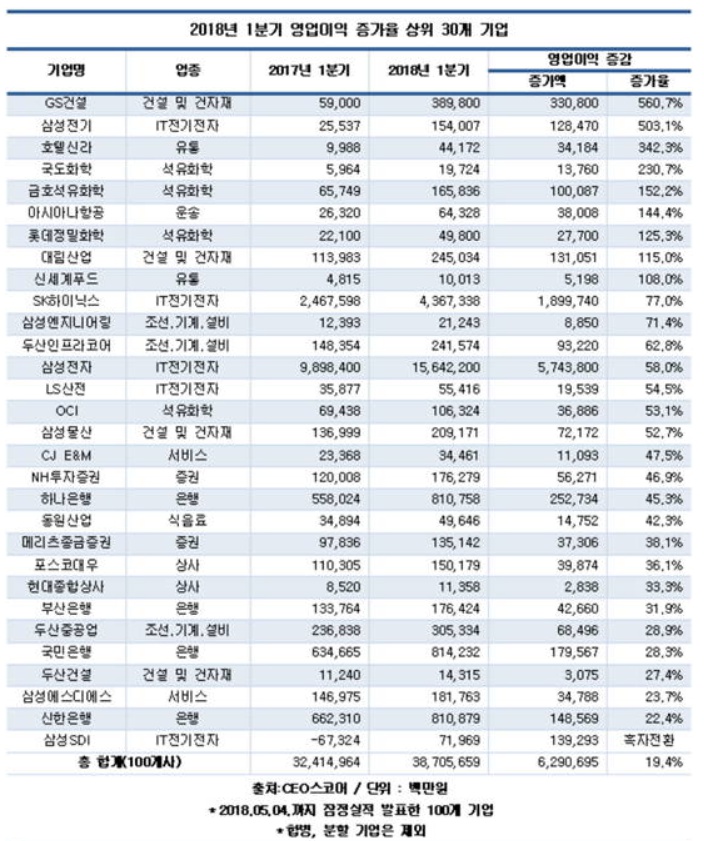 1분기 영업이익이 가장 크게 늘어난 곳은 GS건설이었습니다. 무려 560.7%에 달했습니다. 삼성전기 역시 503.1%로 500%를 넘었고, 호텔신라(342.3%), 국도화학(230.7%), 금호석유화학(152.2%), 아시아나항공(144.4%), 롯데정밀화학(125.3%), 대림산업(115.0%), 신세계푸드(108.0%)가 100% 이상의 높은 영업이익 증가율을 기록했습니다.