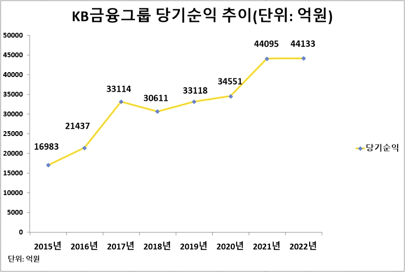 KB금융그룹의 당기순익은 2015년 1조6983억원에서 2016년 2조1437억원, 2017년 3조3114억원, 2018년 3조611억원, 2019년 3조3118억원, 2020년 3조4551억원, 2021년 4조4095억원, 2022년 4조4133억원으로 급격히 성장했다.
