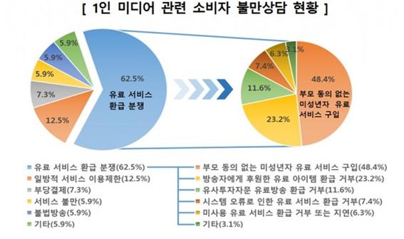 스마트폰 보급이 일반화되면서 인터넷 개인방송(이하 ‘1인 미디어’)도 대중화되고 있다. 하지만 실제 사례와 같이 유료 서비스 환급 분쟁이 끝이질 않고, 미성년자들에 대한 보호장치도 미흡하는 등 다양한 문제점이 있는 것으로 나타나 소비자 주의가 요구되고 있다.