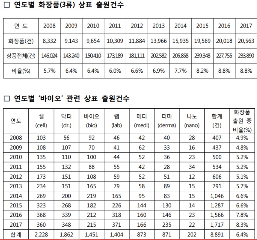 특허청에 출원된 관련 특허의 추세를 보아도 그대로 드러납니다. 분석에 따르면 화장품 분야에서 바이오(bio)을 비롯해 셀(cell), 더마(derma), 메디(medi), 닥터(dr.) 등 ‘바이오 기술(BT)’을 나타내는 문자를 포함하고 있는 ‘바이오’ 관련 상표 및 특허는 2013년부터 2017년 말까지 최근 5년 동안 총 6407건이 출원됐습니다. 이는 2008년부터 2012년까지 5년 동안의 상품 출원 2484건에 비해 약 2.57배 증가한 것입니다.