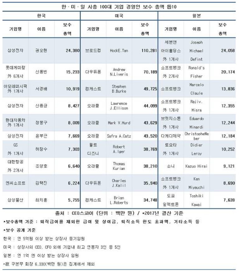 각국 상위 10명의 보수 총계는 한국이 1006억원이었으며 미국은 5091억원, 일본은 1306억원이었습니다.