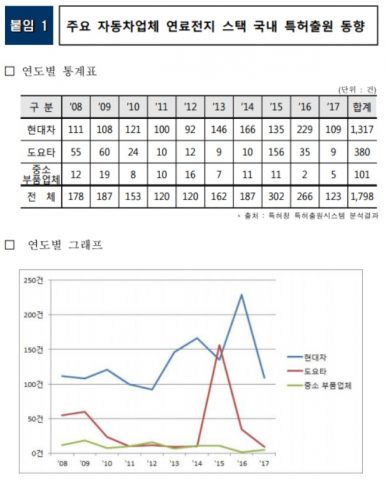 특허청 관계자는 “우리 업체들이 차세대 친환경차인 수소전기차 시장을 주도해 나가기 위해서는 수소 충전 기반시설 구축과 함께 효율적인 연료전지 스택 개발도 요구된다”며 “이를 위해 완성차 업체에서 중소 부품업체로 기술 개발의 선순환이 이뤄지는 환경을 조성해 나가야 한다”라고 말했습니다.