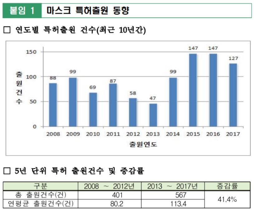 특허청 관계자는 “미세먼지의 1급 발암물질 지정(WHO, 2013년), 메르스(2015년) 등 미세먼지의 유해성 인식과 호흡기 질환의 유행으로 마스크에 대한 관심과 수요가 늘어났기 때문으로 보인다”라고 설명했습니다.