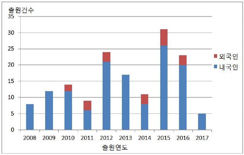 여기서 주목할 점은 중소기업의 출원이 2008년~2011년에는 전체 출원 중 48.8%을 차지했고, 2012~2017년 기간에는 71.2%로 크게 증가하고 있는데 이는 진공 다이캐스팅 기술의 핵심뿌리산업 지정과 고품질 고부가가치 시장의 수요 증대로 중소기업이 적극적으로 뛰어들고 있기 때문으로 풀이됩니다.