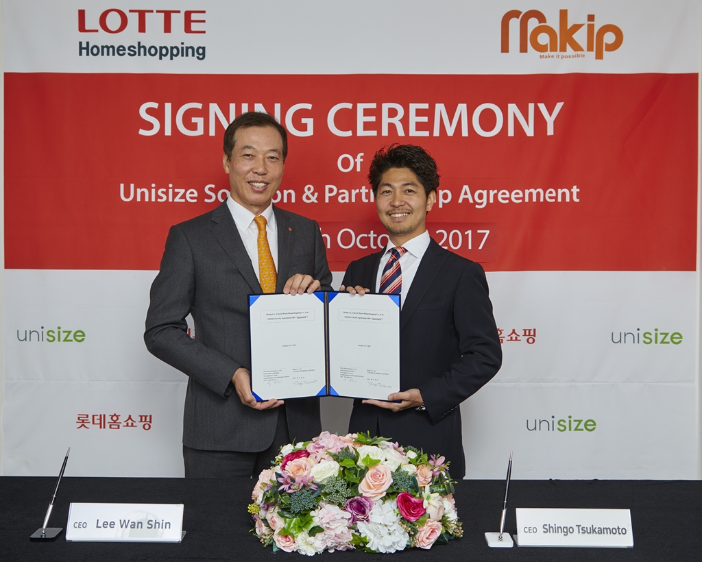 롯데홈쇼핑은 지난 10월 27일 일본의 온라인 피팅 설루션 개발 기업인 ‘메이킵’과 최적의 의류 사이즈를 추천하는 기술인 ‘유니사이즈(Unisize)’를 국내 최초로 도입하는 업무협약을 체결했다고 밝혔다.