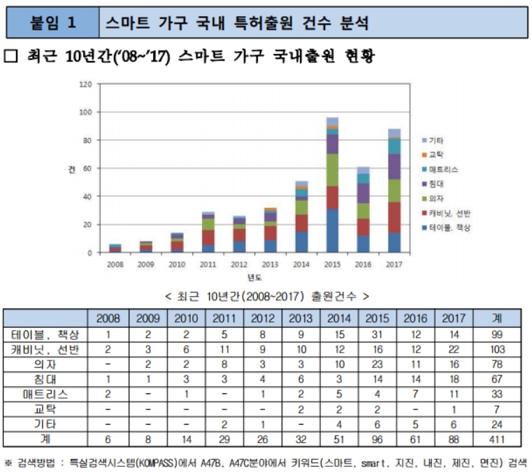 특허청 관계자는 “가구의 디자인 뿐 아니라 맞춤형 서비스의 채용여부가 중요한 가구선택 기준이 될 것이다”며 “젊은 소비자를 사로잡을 수 있는 맞춤형 서비스를 위한 신기술 개발로 반짝이는 아이디어를 가진 청년들의 일자리가 증가할 것으로 기대된다”라고 전망했습니다.