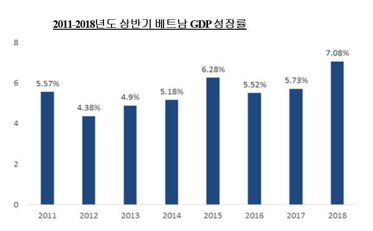한국무역협회(이하 KITA)가 베트남 통계청과 현지 언론 등을 인용한 자료에 따르면 베트남 경제는 2018년 상반기에 7.08%의 성장률을 달성해 2011년 이후 가장 높은 수준의 성장률을 기록했다는 것입니다.