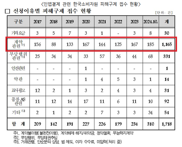 분석 결과 지난 2017년부터 이달 15일까지 접수된 인앱결제 관련 피해구제 신청 1718건 중 67.8%인 1165건은 계약불이행, 계약해지‧위약금, 청약철회, 무능력자계약 등 결제‧환불 관련 피해였다.
